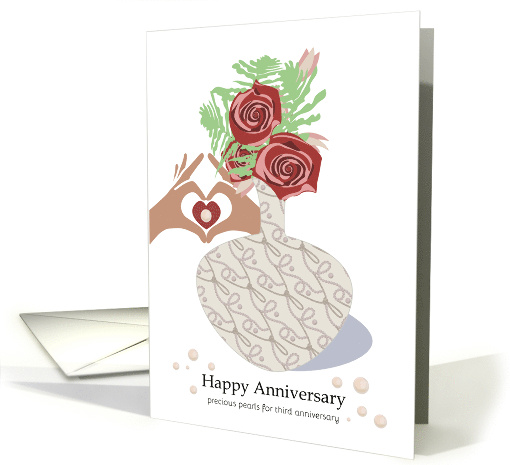 | Artist Notes: | Illustrated vase that is made up of pearl strands. They loop around the vase that contains a rose bouquet. Two hands form the shape of the heart over a red heart with a pearl centered on it. The bouquet is made up of fern, red roses, and other blossoms. Near the base are scattered petals. Pearls are often thought of as a modern gift for the 3rd anniversary. Appropriate for a spouse to receive. No physical embellishments. |