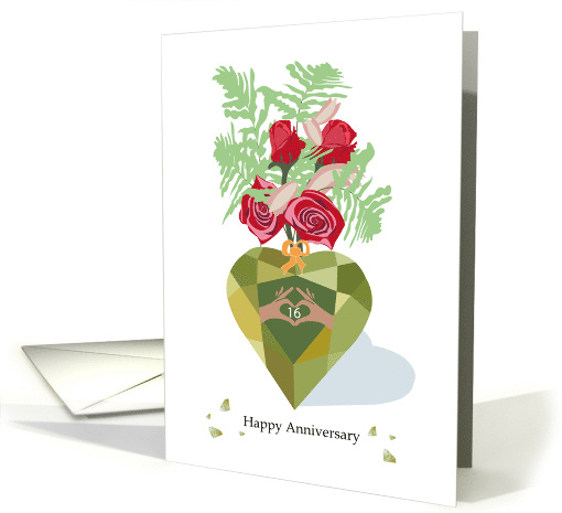 | Artist Notes: | Illustrated vase for an 16th anniversary. The bouquet is made up of fern, red roses, and other blossoms. Near the base or culet is some sprinkling of gems. The faceted heart represents peridot, which is the modern association. Two hands form a shape of the heart. No physical embellishments, printed card only. |
