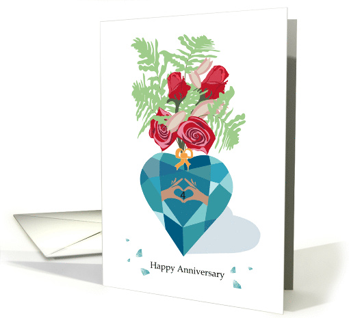 | Artist Notes: | Illustrated vase that represents a faceted heart topaz. The vase contains a rose bouquet. The bouquet is made up of fern, red roses, and other blossoms. Near the base are scattered petals. Appropriate for a spouse to receive. Two hands form the shape of the heart on the table or main facet. The number 4 designates the year. No physical embellishments are present. Inside text reads: You put a sparkle in every day and every year is brighter. Happy Anniversary. |