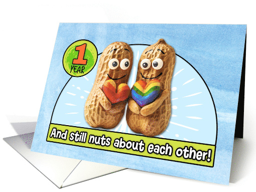 A pair of smiling peanuts each holding a rainbow-colored hearts on a light-blue watercolor background and the text "1 year and still nuts about each other!" A sweet card to send to that fabulous gay couple that has been together for 1 year.