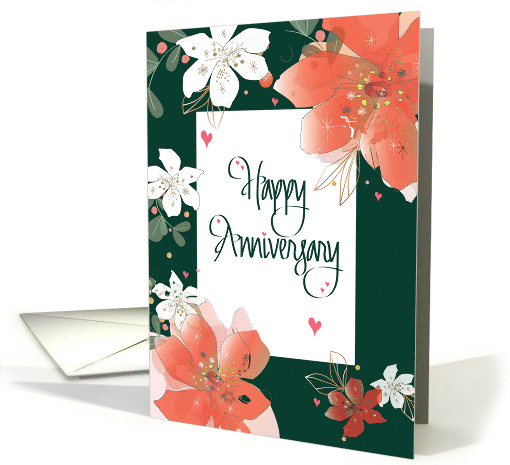 Beautifully elegant green hand lettered wording, at the center of the white rectangle, on this Christmas eve wedding anniversary card says "Happy Anniversary", with accents of tiny dark pink romantic hearts. Every corner of the inner white rectangle has large Christmas poinsettias, in colors of red, pink and white. These holiday flowers decorate the beautiful card, and its edges, with holiday festivity. Tiny red hearts of love also decorate the dark green background. Golden-colored leaf outlines add to the poinsettia groupings, beautifully. The inside wording of the card says "Hoping your anniversary on Christmas eve sparkles with love and joy!"