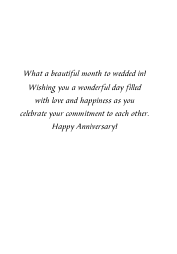 | Inside: | What a beautiful month to wedded in! Wishing you a wonderful day filled with love and happiness as you celebrate your commitment to each other. Happy Anniversary! |