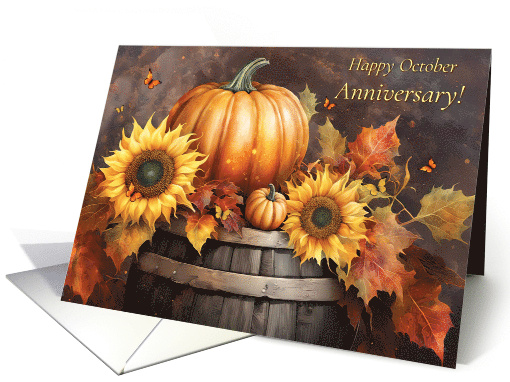 | Artist Notes: | Send pretty and wonderful wishes to a couple that celebrates their wedding anniversary in October! A cute country image of pumpkins, sunflowers and leaves on a rugged barrel. |