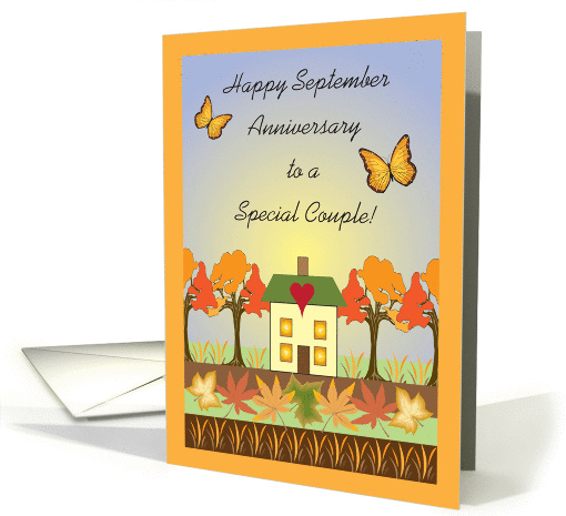| Artist Notes: | This is a September wedding anniversary card, featuring a yellow house, fall leaves, trees, and 2 butterflies. You may change the inside message at checkout, if you wish. |