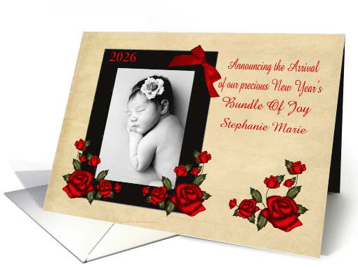 | Artist Notes: | Announce the arrival of your new years baby with a custom name and year photo card featuring a pretty wood frame with roses, a bow and text set on a vintage background. A perfect way to show off your bundle of joy. Front has a text box for the name of your little sweetheart and a text box for the year. Original design by Laurie Schneider, elements by HF-Projekte, Diana'z Designz. Example year 2026 |