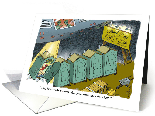 | Artist Notes: | The cartoon birthday card shows a UFO and the aliens inside abducting an outdoor occupied construction toilet with a tractor beam. |