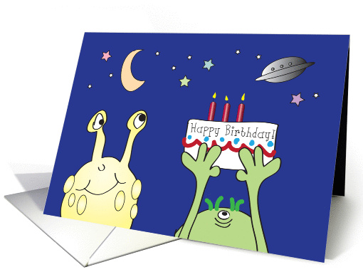 | Artist Notes: | Give this aliens birthday card to someone who is into aliens and outer space, featuring 2 aliens, moon, a birthday cake, candles, stars, and a UFO. You can change the inside message at checkout, if you wish. |