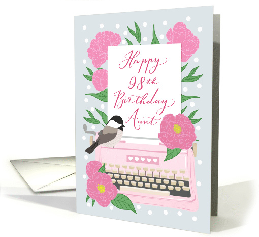 A pink vintage typewriter surrounded by flowers and leaves with a chickadee bird perched on the typewriter. A piece of paper from the typewriter has the handwritten words Happy 98th Birthday Aunt. A lovely birthday card for your aunt turning 98!