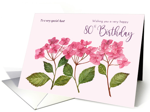Share the beauty of nature with our elegant greeting card, featuring a stunning watercolor illustration of pink hydrangea lacecaps. This botanical design is sure to uplift spirits and bring a touch of summer joy to anyone who receives it. The card design is for Aunt on 80th Birthday and can be customized for any relation.