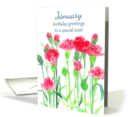 | Artist Notes: | January birthday greetings to a special aunt decorated with bright red and pink carnation flowers, which are the birth flower for this month, illustrated with watercolor. Pretty green stems, leaves, and flower buds complement the blooms. |