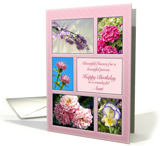A birthday card for an aunt. Send beautiful flowers to a beautiful person. A birthday card with a beautiful sentiment. A collection of framed pictures of flowers on a pink background.