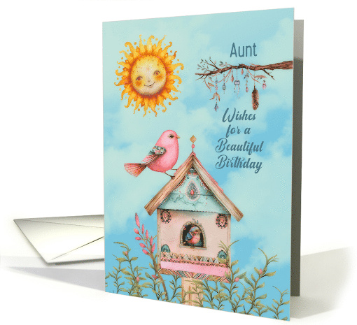 Delight your aunt on her birthday with this lovely boho look design. Featuring a pair of birds, a sun, a tree limb adorned with jewels and a bright blue sky with clouds, this design is sure to please.
