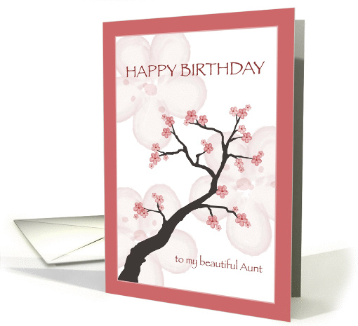 Beautiful birthday card for your aunt features illustration of a Chinese blossom tree with pink flower petals in a frame of coordinating colors.