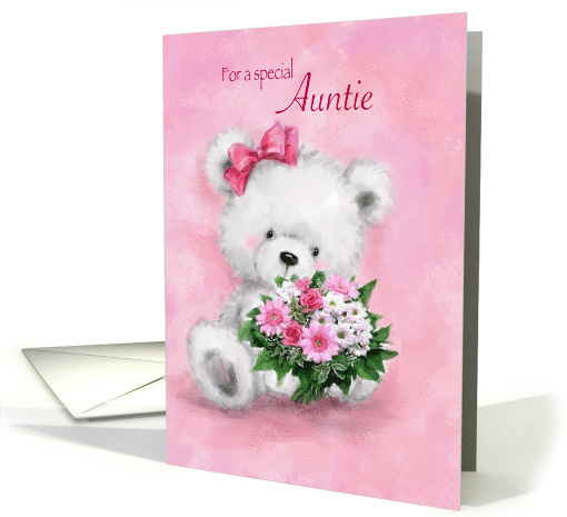 Birthday for Auntie , White Bear Holding Bunch of Pink Flowers