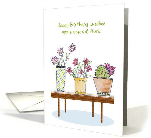 This birthday wish for an aunt features a trio of potted plants and flowers with pink leaves and sit on a wooden look table. The artwork is done in a whimsical watercolor style.