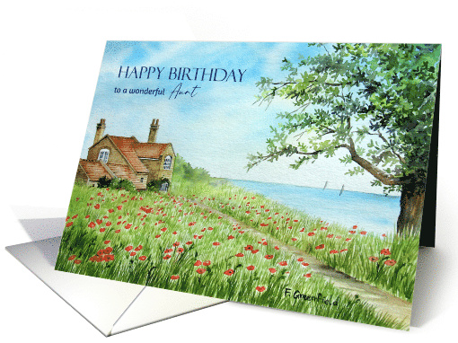 Brighten someone's day with this charming greeting card, featuring a watercolor painting by Farida Greenfield. The picturesque scene of an English coastal path and field, complete with poppies, a stone house, sailing boats, and a clear blue sky is a delightful sight to behold. Send a message of love and joy with this beautifully crafted card. The card design is for Aunt on Birthday.