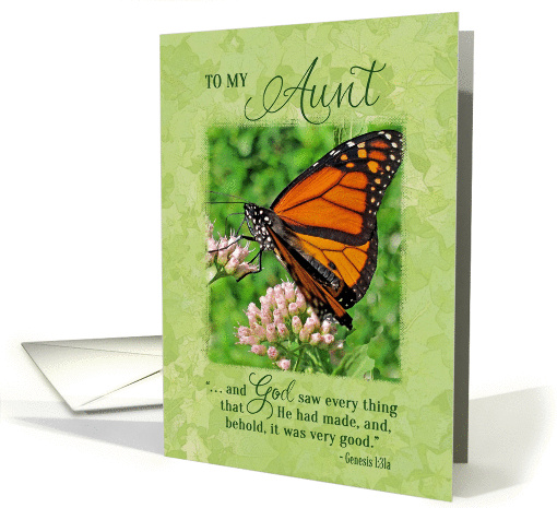 Birthday card for Aunt with green muted leaves in the background and a bright, beautiful picture of a butterfly and a bible verse. Designed by Rycky Creations; photo by R. Chaffin