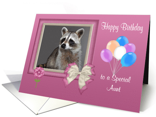 Birthday to Aunt, Beautiful raccoon in bow frame with balloons, flower