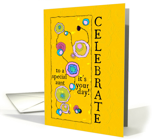 Say Happy Birthday to a special aunt." It's your day, Celebrate" is the sentiment on the front of this pop art inspired colorful design. Circles and swirls float on a textured bright yellow background..Original design by Betsy Bush for Dragonfire Graphics.