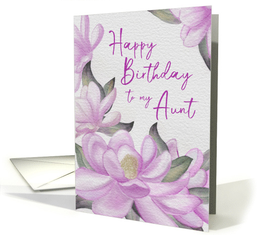 "Happy Birthday to My Aunt" is a beautiful card to send a special family member. The card is illustrated with watercolor pink magnolias. The soft purple-pink petals border the majority of the card, while green variagated leaves peek through the petals.