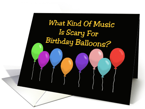 funny Birthday Card with cartoon balloons on a black background. The words say: What kind of music is scary for birthday balloons? Inside says: Pop Music! Happy Birthday