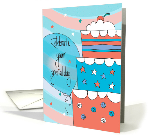 This very special and colorful stacked birthday cake card is the perfect way to wish family, friends and neighbors a happy birthday this year. The cake, stacked along the card's right side, layers melon, blue, and stripes of melon and lavender, in cake layers up towards the top of the card. Drops of white frosting fill the top of each of the three sections, with a dollop of white whipped cream on the top of the cake, enhanced with a maraschino cherry. On the cake's left side, a large inflated blue balloon peeks around the edge of the cake, with hand lettered wording inside that says "Celebrate your special day". The inside wording of the card says "Celebrating your birthday is a real joy! Have a wonderful day where all your dreams come true!"