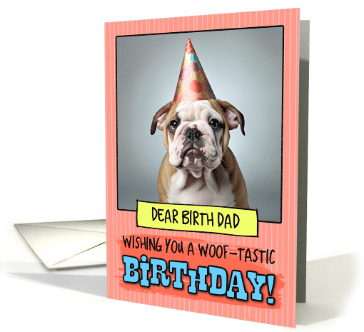 | Artist Notes: | An english bulldog puppy wearing a birthday hat on a salmon-pink background with a stripe pattern with 'dear birth dad' in a yellow box and the text "wishing you a woof-tastic birthday!". A fun card to send to your birth father for their birthday. |