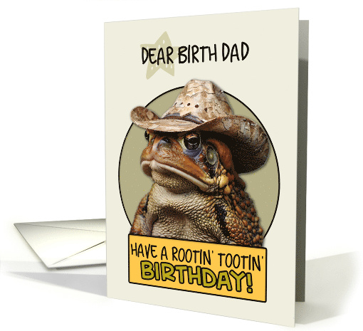 | Artist Notes: | A hilarious toad wearing a cowboy hat on a soft green background with the text "dear birth dad have a rootin' tootin' birthday! A fun birthday card with a country twist to send to your wonderful birth dad for their special day |