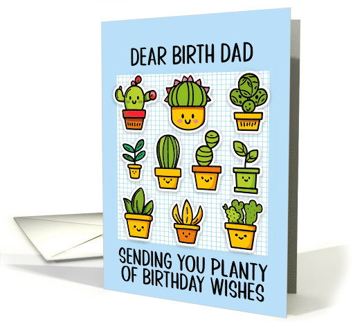 | Artist Notes: | A whole bunch of kawaii cactus and succulent plants in pots on a light blue background with the text "dear birth dad sending you planty of birthday wishes". A wonderful birthday card to send to your special plant loving birth dad |