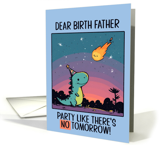 | Artist Notes: | A cute prehistoric cartoon dinosaur wearing a birthday hat - in a clean kawaii style with bold black outlines - is watching a burning comet come closer (and we all know what happened to the dinosaurs back then) in the night sky and the text "dear birth father party like there's no tomorrow!" A fun card to send to your wonderful birth father for their special day. |