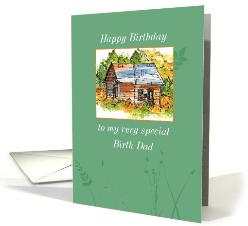 | Artist Notes: | Happy Birthday greetings to a very special birth dad decorated with a rustic cabin in the hills sketched with ink and watercolor on a green background accented with plants and leaves. |