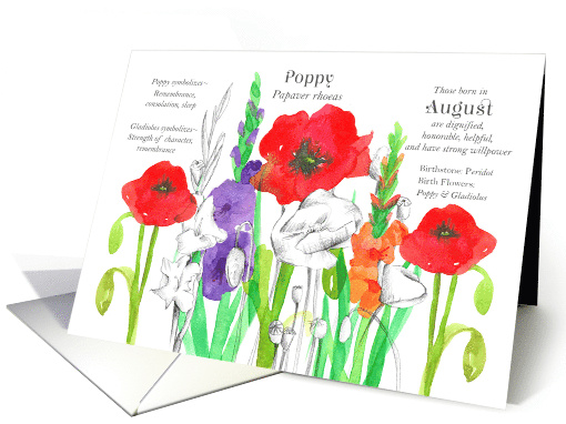 | Artist Notes: | Happy August Birthday greetings featuring the birth month flowers of poppies and gladiolus in vibrant shades of red, orange, and purple watercolor along with pencil botanical studies accented with flower symbolism and some fun personality characteristics. |