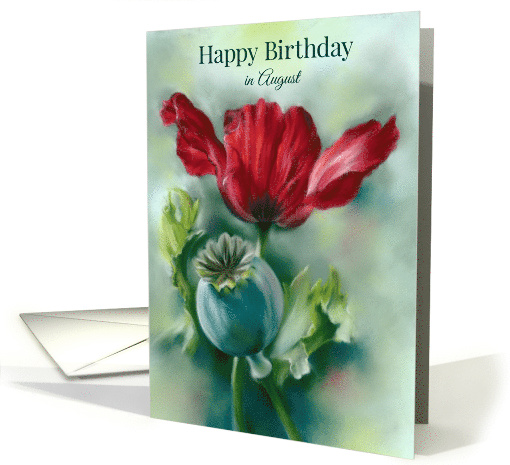 | Artist Notes: | Poppy is a birth month flower for those born in August. This lovely greeting features floral artwork in rich pastel hues picturing a vivid red poppy along with its rounded seed pod and leaves of green. |