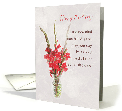 The card is a birthday greeting card themed around the bold and vibrant beauty of the gladiolus, which is the birth flower for August. The front features a watercolor illustration that I did of a bouquet of bright red gladioluses in a glass vase. The petals are a vivid red, radiating energy and warmth, contrasting beautifully with the green stems. This message aims to capture the essence of the birthday while drawing a correlation between the special qualities of the person receiving the card and the flower.