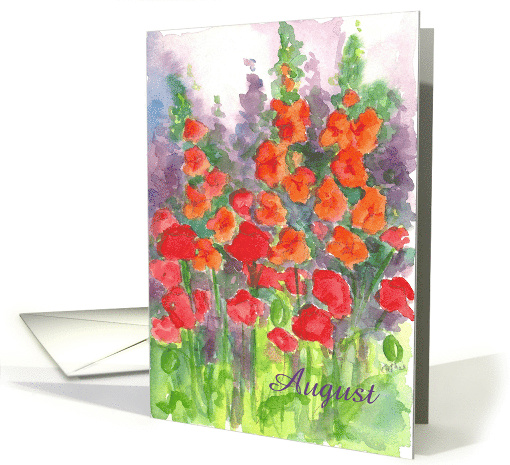 | Artist Notes: | August birthday greetings featuring a vibrant garden of tall orange gladiolus flowers and bright red poppies, the August birth month flowers, with warm shades of plum purple in the background illustrated with watercolor. |