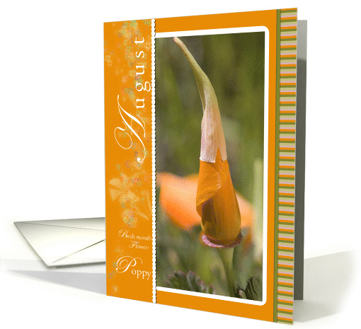 | Artist Notes: | Photograph of a budding poppy flower for a Happy Birthday card. Poppy is the birth month flower for the month of August. Inside card: The florals of the Poppy a symbol of imagination and commemoration exquisite and colorful blooms bring you bursts of Birthday fun. Happy Birthday |