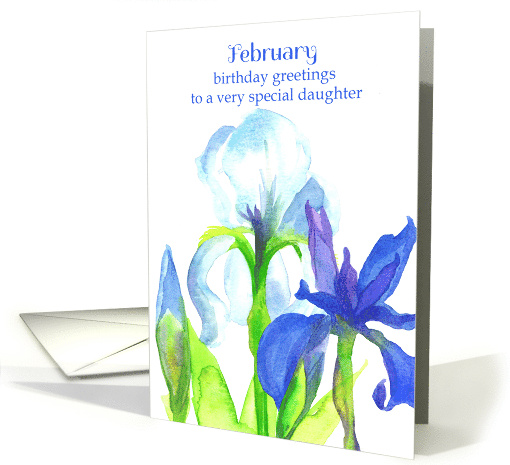A pretty floral birthday card for a special daughter decorated with iris flowers illustrated with watercolor in a variety of blue shades on a white background.