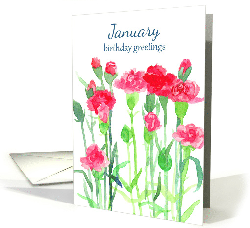 | Artist Notes: | A colorful happy birthday card for someone with a birthday in January featuring the birth month flower with an arrangement of of bright pink and red carnations |