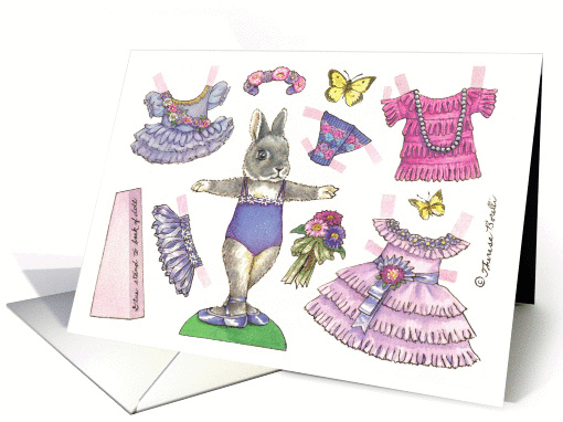 | Artist Notes: | This September birthday kid's activity card features a ballerina bunny with an aster themed dance wardrobe. Paper doll greeting cards are appropriate for doll collectors as well as kids. |