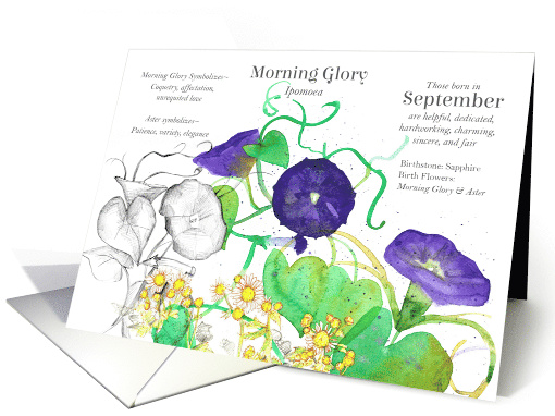 | Artist Notes: | Happy birthday greeting card featuring the birth month flowers of September, the morning glory and asters, hand drawn with pencil, ink and painted with watercolor accented with watercolor spatter spots. Also included are Language of flower symbolism and some personality characteristics. |