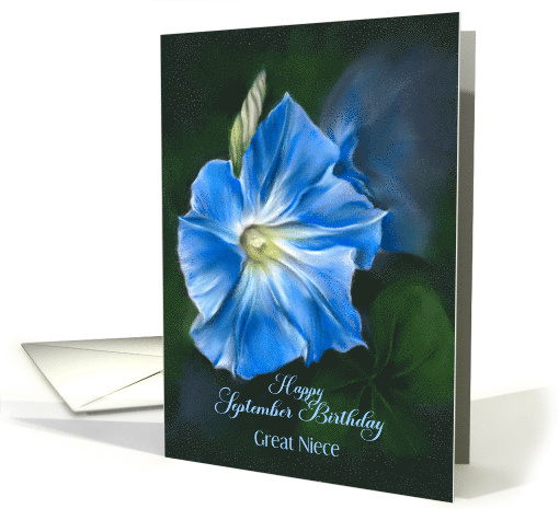 | Artist Notes: | Whether she is known as your great niece or grandniece, she is bound to love this personalized birthday card for someone with a special day in September. The front features floral artwork in soft pastel hues depicting a blue and white morning glory, bud and green leaves. |