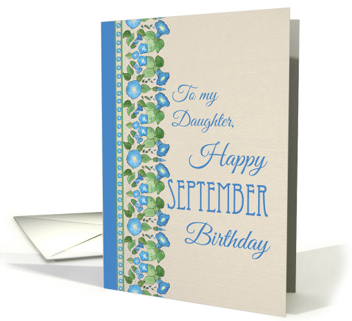 A pretty September Birthday Card for a Daughter, with a nostalgic, hand-painted border of bright blue Morning Glory Flowers (the September Birth Month flower) on a Stone background. The text is in matching blue and the inside is left blank for your own message.