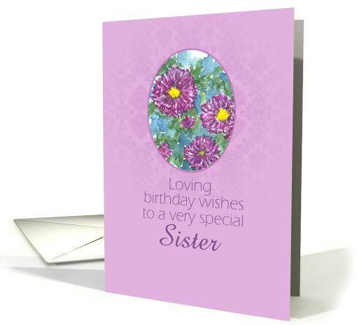 Loving birthday wishes for a very special sister greeting card decorated with bright purple aster flowers painted in watercolor on a soft lilac background accented with a lacy pattern. Design and illustration by Cathie Richardson.