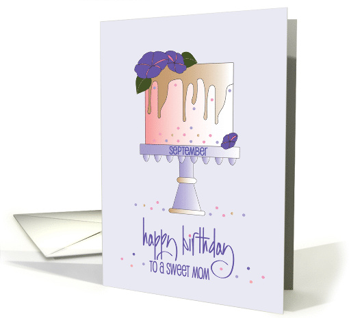 "Happy Birthday - to a Sweet Mom" is the magnificently artistic deep lavender hand lettering, that fills the bottom of this birthday card for your mom's September birthday. The word "September" crosses the base of the light lavender cake stand, at the center of the card, on which a delicious sprinkle-filled light pink cake, drips all the way across the front with caramel frosting. Decorations of deep purple and pink morning glories add beauty to the birthday cake, both at the top left and the bottom right. Sprinkles of pink, purple and dark pink enhance the wording, the cake and the base of the cake stand. The inside wording of this beautiful September birthday card for your mom says "Wishing you a wonderful birthday where all your dreams come true, with love."