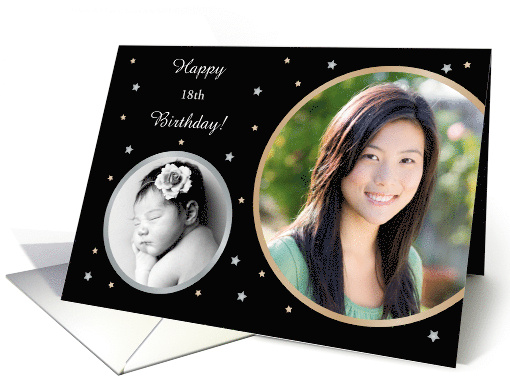 | Artist Notes: | Personalize this elegant two photo Then & Now Happy 18th Birthday card (or any special age) with a smaller and larger photo. Black background with silver colored & gold colored photo borders & stars offset the photos beautifully & let your images shine. (NOTE THAT THIS IS NOT A METALLIC FOIL CARD.) Customize inside text too! |