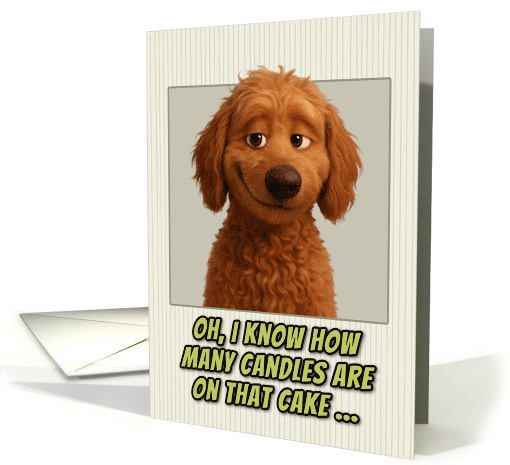This birthday card features a realistic portrait of an adorable Irish Doodle dog. The dog has expressive brown eyes and a smirk on it's face.The portrait is set against a cream-colored background with subtle vertical pinstripes. Below the dog's image, green text with black outlines reads: "OH, I KNOW HOW MANY CANDLES ARE ON THAT CAKE..." This creates the same humorous birthday message about age awareness, but now from a dog's perspective. The card plays on the idea that pets are always watching and observing their owners, turning this into a playful joke about birthday candle counting and getting older. Perfect card for dog parents, dog lovers, people who appreciate gentle age humor, milestone birthdays, and people who enjoy cards with attitude and personality.