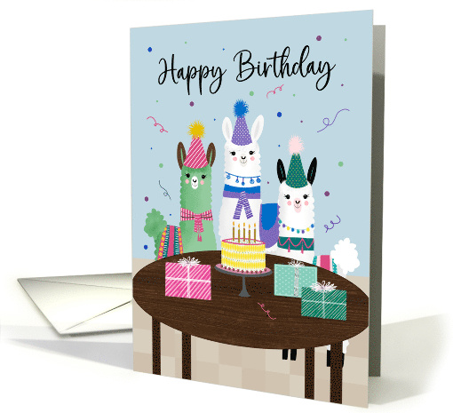 | Artist Notes: | This delightful birthday card features three llamas having a joyous celebration with a cake and presents. The background is a light blue wall with a creamy patterned floor, and the text reads, “Happy Birthday.” |