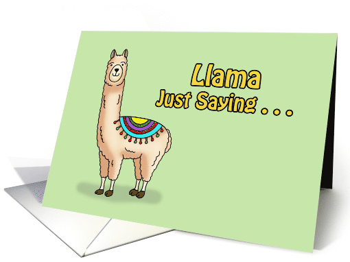 | Artist Notes: | Humorous Birthday Card with cartoon Llama on a green background. The words say: Llama just saying . . . (a pun for I'm a just saying) Inside says: . . . have a happy birthday! |