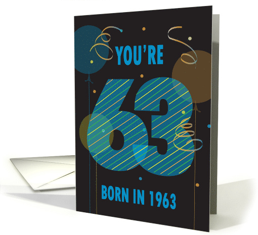 | Artist Notes: | Celebrate someone special's Beddian Birthday during the year of 2026, who is turning 63 years old and was born in the year of 1963. This dynamic black, blue balloon and streamer-filled card has a large blue numeral "63" filling the center of the black card, popping out with colors of blue and green. The blue and orange balloons and streamers add to your birthday wishes. The blue wording of the card says "You're 63 - Born in 1963". The inside wording of the card says "Happy Beddian Birthday to a special 63 year old!" |