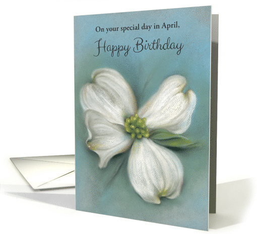 Celebrate an April birthday or customize this card any way you choose. It is embellished with a lovely spring blooming dogwood in pastel shades of white, cream and gray accented with muted blue and green hues perfect for springtime.